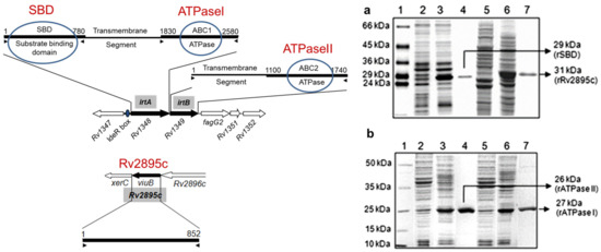Recombinant proteins, IrtA, IrtB, ATPaseI, ATPase II, SBD, and Rv2895c, were procured through cloning, followed by an expression in the E. coli BL-21 codon+ cells and subsequent purification, as described in Material and Methods Section 2.1. The results of the expression and purification are provided in Figure 2a,b. In Figure 2a, lane 3 shows induced rSBD, while lane 4 is the purified recombinant SBD protein, lane 6 is induced rRv2895c, and lane 7 is the purified recombinant Rv2895c protein. In Figure 2b, lane 3 shows induced ATPase II, while lane 4 is the purified recombinant ATPase II protein, lane 6 is induced recombinant ATPase I, and lane 7 is the purified recombinant ATPase II protein. The left panel in Figure 2 illustrates the representation of the cloned genes and domains on the M. tuberculosis genome.