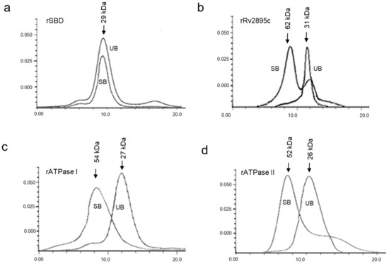 The rATPase I and rATPase II domains and SBD and Rv2895c proteins were expressed and purified, as shown in Figure 2a,b. The expression and purification procedures of IrtA and IrtB integral membrane proteins are provided elsewhere [12]. Briefly, for the expression and purification of rATPase I, rATPase II domains, rSBD and rRv2895c, E. coli BL21 cod+ cells were transformed with the recombinant constructs, and the proteins were purified as described previously [12]. To check the protein expression and subsequently confirm the purity of each sample, western blotting of the induced samples and eluates was done using anti-His and protein-specific antibodies. The protein concentrations were measured using a BCA estimation kit. The proteins were finally concentrated using Amicon concentrators to a final concentration of 1 mg/mL.