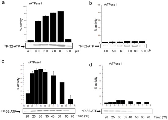 ATPase I but not ATPase II activity is dependent on pH and temperature. The (a,b) pH and (c,d) temperature stability of ATP binding and hydrolysis of (a,c) ATPaseI and (b,d) ATPaseII is shown. ATP hydrolyzing activity of the two proteins is represented as a histogram indicating % activity as a function of pH or temperature whereas ATP binding is shown by αP32-ATP autoradiogram as panel below the activity graph for each set. The temperature dependence was monitored using buffer at pH 8.0 and pH dependence was monitored keeping the temperature constant at 30 °C.