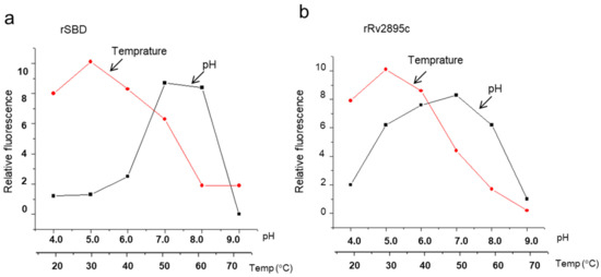 pH and temperature profiling of substrate binding to SBD and Rv2895c. Fluorescence quenching, indicative of substrate binding, was evaluated across varying pH levels and temperatures for (a) SBD and (b) Rv2895c. The curves with circular data points represent the temperature dependence of substrate binding, while those with square data points illustrate pH dependence. cMyco was used as the substrate for SBD, and Fe-cMyco for Rv2895c. The graph presented is representative of three independent experiments, showing relative fluorescence (δF/F) as a function of pH or temperature.