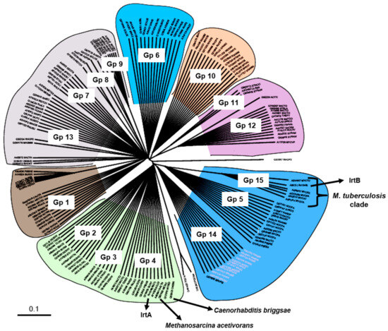 Phylogenetic tree indicating protein function based evolutionary relationship of IrtA and IrtB. A phylogenetic tree was constructed to illustrate the evolutionary relationships of IrtA and IrtB based on their protein functions. The tree comprises 15 groups, labeled Group 1 (Gp1) through Group 15 (Gp15). Group 4 (Gp4) includes M. tuberculosis IrtA along with functionally related proteins from archaea and eukaryotes. Group 15 (Gp15) contains IrtB and transporters that are exclusive to the mycobacterial clade.