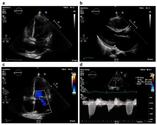 Preoperative echocardiographic findings. (a) Apical four-chamber view in end-diastolic state showing generalized hypokinesia of the left ventricle with a left ventricular ejection fraction of 20%. (b) Parasternal long axis view showing left atrial dilation. (c) Apical four-chamber view showing moderate mitral regurgitation. (d) Severe tricuspid regurgitation with elevated pulmonary artery systolic pressure of 32 mmHg.