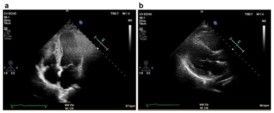 Postoperative echocardiographic findings. (a) Apical four-chamber view in an end-diastolic state showing a normal-sized left ventricle with a left ventricular ejection fraction of 68%. (b) Parasternal long axis view showing normal RV and LV size.