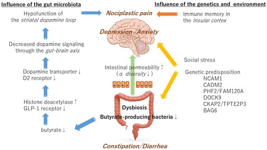 It should be noted that autism is a psychiatric disorder that is associated with gut dysfunction and is related to the brain–gut-microbiota axis. Experiments employing contactin-associated protein-like 2 knockout mice, a model for autism, have demonstrated that the hyperactivity observed in autism is genetically determined and that the lack of sociability is caused by intestinal bacteria []. It has been demonstrated that mice models of autism exhibit symptoms resulting from genetic and microbial factors. Thus, some symptoms of IRB may be regulated by gut bacteria via the brain–gut axis, whereas other symptoms are more likely to be due to genetic factors. Although the coexistence of gastrointestinal inflammation and depression in IBS may be largely genetically controlled, the pain pathways in the brain that determine how pain is felt may be a symptom of the gut microbiota (Figure 2).