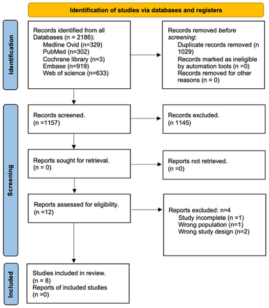 After removing duplicates, the search revealed 2186 studies through databases and registers (Figure 1). Twelve studies were obtained after screening and were reviewed thoroughly to assess their eligibility. Eight studies were finally selected for inclusion in this review.