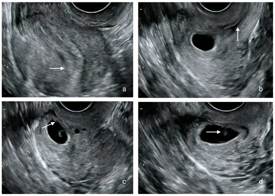 Transvaginal ultrasound findings. (a) The empty uterine cavity marked with a white arrow; (b) the empty cervical canal marked with a white arrow; (c) the gestational sac embedded at the site of the previous lower uterine segment and the thin layer of myometrium between the gestational sac and the bladder marked with a white arrow; (d) the presence of the fetal pole.
