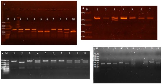 The electrophoresis results of RFLP products. Lane M indicates DNA molecular marker GeneRuler Ultra Low range DNA ladder (A,D) (Thermo Fisher Scientific Baltics, Lithuania); GeneRuler Low range DNA ladder (B,C); (A) PCR-RFLP products for DMNT1 (rs2228611). Lanes 1, 3, 7—AA genotype; lanes 2, 4, 8–9—AG genotype; lanes 5–6, 10—GG genotype; (B) PCR-RFLP products for DMNT1 (rs2228612). Lanes 1–2, 4–7—AA genotype; lane 3—AG genotype; (C) RFLP products of DNMT3A (rs2276598). Lanes 1, 3, 5, and 7 indicate the CC genotype; lanes 4, 6, and 8–10 demonstrate the CT genotype; lane 2 shows the TT genotype; (D) RFLP products of DNMT3A rs752208. Lanes 1–3, 5–6, and 9 indicate the CC genotype; lanes 4 and 7 demonstrate the CT genotype; lane 8 shows the TT genotype.