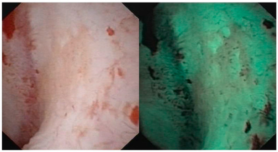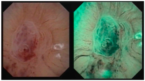 The protocol for the selection of the study group patients comprised a contrast CT scan, urinary cytology, abdominal ultrasonography, cystoscopy, and digital flexible ureteroscopy. The endoscopic inspection of the entire pyelo-caliceal system (renal pelvis and all calyces) was performed in both white light and NBI and the suspected tumoral lesions were marked on a map. After the map of suspicious areas was created, all the lesions visualized in any of the two modes (either white light or NBI (Figure 1 and Figure 2)) were biopsied. For this stage, a biopsy (grasping) forceps was used in all cases. When performing this stage, special attention was given to going as deep as possible in the pyelo-caliceal wall, in order to obtain good samples, with minimal staging error.
