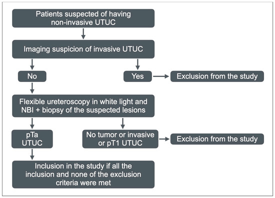 This diagnostic protocol was applied in 87 consecutive patients admitted for primary suspicion of non-invasive UTUC (those with imaging signs of invasive tumors being excluded for the beginning). After the pathological exam, patients with invasive tumors and those with invasion in the lamina propria were also excluded. Finally, we identified 61 patients with malignant tumors that met all the inclusion criteria and did not have any exclusion criteria, and included them in the study group (Figure 3).