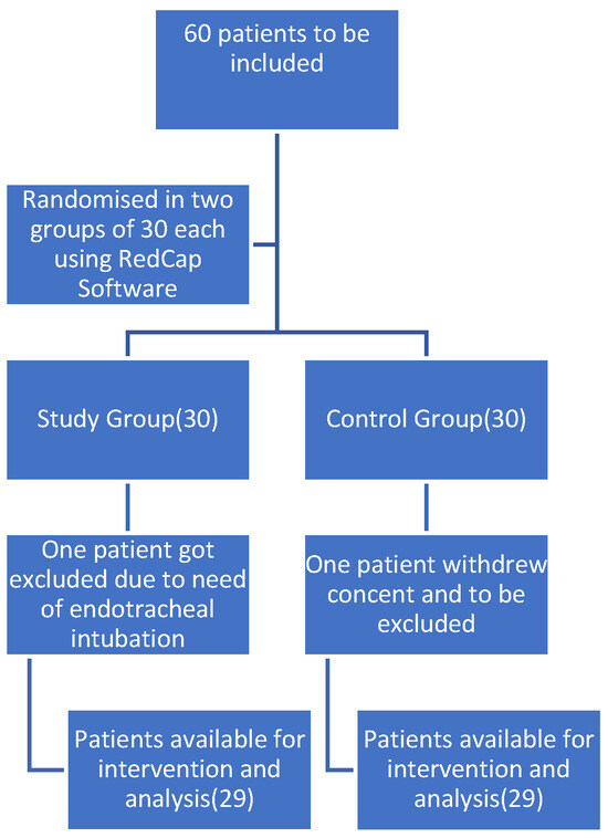 Patients were recruited from May 2022 to November 2023. Out of sixty patients initially enrolled, two were excluded (Figure 1). One patient from the study group was excluded as she needed endotracheal intubation, while one from the control group was excluded as she withdrew consent to participate in the study. Thus, fifty-eight patients (twenty-nine per group) were available for analysis. There was no statistically significant difference in height, weight, age, BMI, smoking, or alcohol consumption between the groups (Table 1).