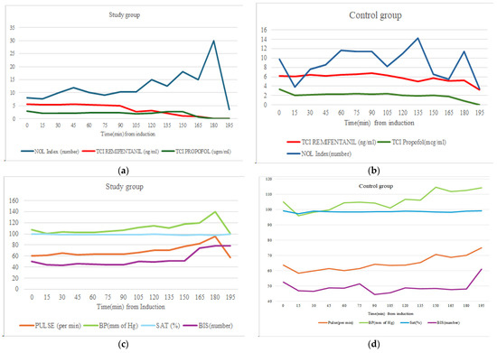 The dynamic changes in these parameters in relation to each other in both groups are shown in the graphs in Figure 2a–d. The graphs demonstrate higher remifentanil infusion rates in the control group than in the study group. In the study group, there was an increase in the NOL index along with BIS and hemodynamic parameters during the last 30 min of the procedure, which, except for the BIS, decreased until the end of anesthesia. However, the NOL index remained stable in the control group until the end of the procedure.