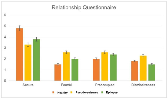 The mean scores of pseudo-seizures patients, epilepsy patients, and the healthy group for the four items (secure, fearful, preoccupied, and dismissiveness) of the Relationship Questionnaire.