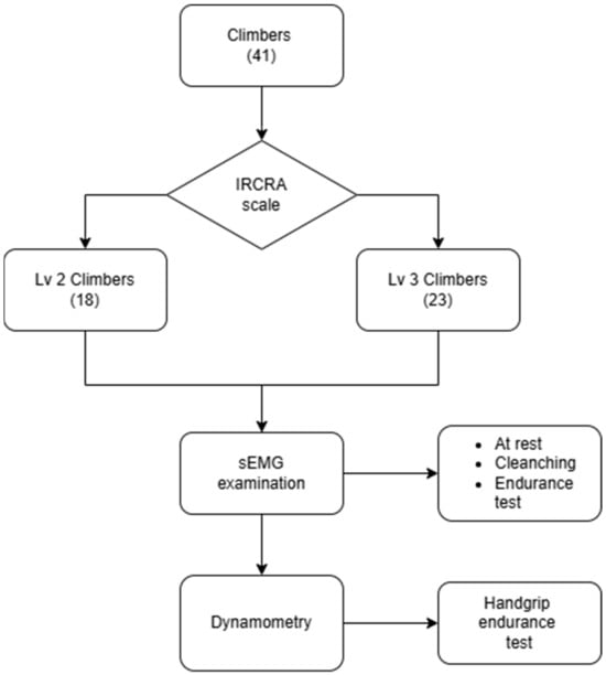 Before starting the study, the participants were asked to complete an original questionnaire assessing their climbing abilities according to the International Rock Climbing Research Association scale (IRCRA) []. Using this scale, the climbers were divided into two groups, i.e., an intermediate group (Lv2, according to the IRCRA scale) and an advanced group (Lv3, according to the IRCRA scale). Then, the participants were familiarized with the study protocol and research equipment. All participants in the study were athletes actively engaged in sport climbing. The grip strength test was carried out using a dynamic protocol consisting of 12 maximal contractions performed on a dynamometer. Following the same procedure, the activity of the masticatory muscles was then tested.