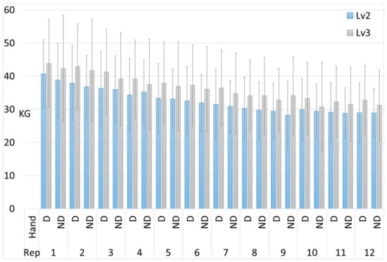 Statistically significant differences with medium effect size were found between the preferred and the non-preferred sides in repetition one (p = 0.02, ES = 0.36), six (p = 0.009, ES = 0.41), nine (p = 0.006, ES = 0.43), eleven (p = 0.02, ES = 0.37), and twelve (p = 0.03, ES = 0.34) in favor of the non-preferred side. Interaction analysis showed that statistically significant side differences occurred in group Lv3 in the first and sixth repetition (p = 0.02, Z = 0.36; p = 0.03, ES = 0.35). In both, the non-preferred side showed greater activity than the preferred one. In group Lv2, statistically greater activity was also observed on the non-preferred side compared to the preferred one in the ninth repetition (p = 0.04, ES = 0.32).