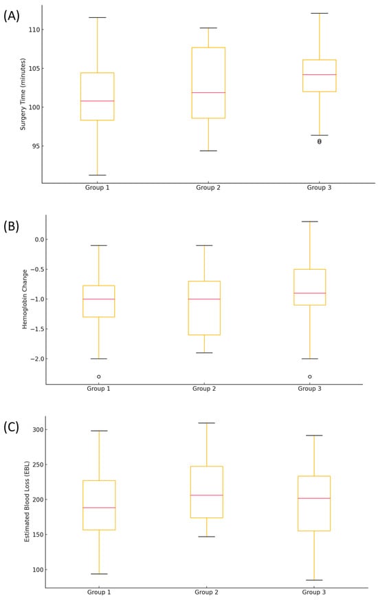 The surgical outcomes are summarized in Table 2. The time required for surgery differed significantly among the three groups (p = 0.006). Post hoc analysis revealed no difference in surgery time between Groups 2 and 3; however, Group 1 had significantly shorter surgery times than Groups 2 and 3 (Figure 1A). No significant differences were found in the hemoglobin level changes from pre- to post-operation among the groups (Figure 1B). Although the difference in the estimated blood loss was not statistically significant, Group 2 showed a tendency toward higher blood loss compared to the other groups (Figure 1C).