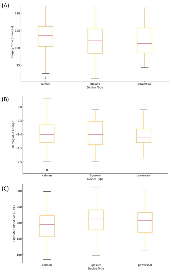 Impact of the type of advanced energy device on surgical outcomes. (A) Surgery Time: No significant differences were observed in surgery times among the three advanced energy devices (LigaSure™, Caiman™, and PowerSeal™). (B) Hemoglobin Level Changes: Changes in hemoglobin level from pre- to post-operation were similar across all three devices, with no significant differences. (C) Estimated Blood Loss: Although no statistically significant differences were found, slight variations in estimated blood loss were observed among the three device types.