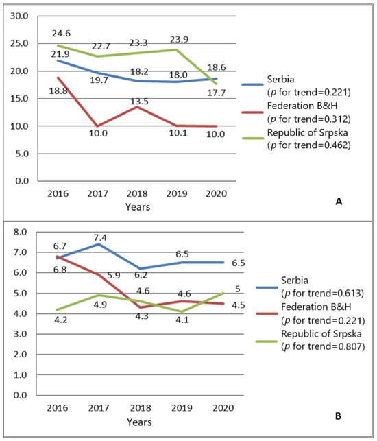 Standardized incidence (A) and mortality (B) rates of cervical cancer in Serbia, the Federation of Bosnia and Herzegovina, and the Republic of Srpska (2016–2020). Note: the Mann–Kendall trend test was used to analyze trends.