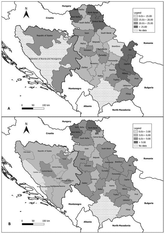 Serbia and Bosnia and Herzegovina are neighboring countries located in the Balkan region of southeastern Europe. Serbia covers an area of 88,499 km2 and is divided into 25 administrative units. According to the most recent data before the period under investigation (2011 Census), the population of Serbia was 7,186,862 (without data from the Autonomous Province Kosovo and Metohija) [,]. With a real GDP per capita of USD 26,074 in 2023, the economy of Serbia is ranked 38th out of 48 European states, below most neighboring countries except Bosnia and Herzegovina, North Macedonia, and Albania []. Bosnia and Herzegovina shares a border with Serbia to the east, Montenegro to the southeast, and Croatia to the southwest, west, and north []. The country is highly decentralized, consisting of two constitutive entities, the Federation of Bosnia and Herzegovina (FB&H) and the Republic of Srpska (RS), and the Brčko District. The FB&H is subdivided into 10 administrative units—cantons—while the RS is presented as a single unit, as it is not divided into administrative units according to its Constitution. The total area of Bosnia and Herzegovina is 51,209 km2, and the estimated population is 3,434,000. With a real GDP per capita of USD 19,634, Bosnia and Herzegovina ranks 43rd out of 48 European states, making it poorer than all neighboring countries [,].