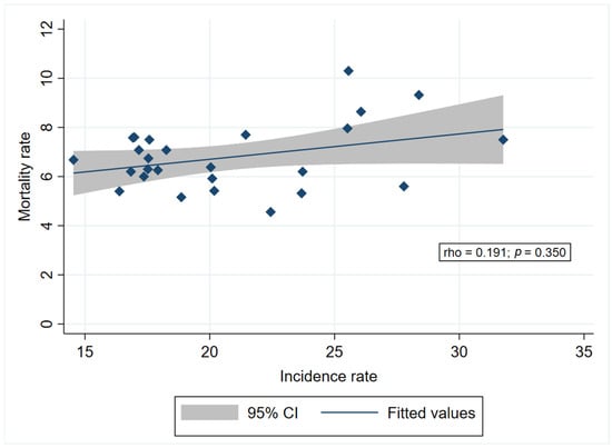 Additionally, Figure 3 shows a weak positive correlation between average incidence and average mortality rates of cervical cancer across the included administrative units, although this correlation is not statistically significant (rho = 0.191, p = 0.350).