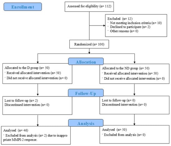 In this study, a total of 100 participants were enrolled (Figure 1). Two participants in the D group were lost to follow-up. Another two participants in the D group were excluded from the analysis due to high TRIN and VRIN results, indicating invalid MMPI-2 responses. Thus, 46 participants in the D group and 50 participants in the ND group were finally analyzed. Both the D and ND groups each consisted of an equal number of normal participants and patients with CLBP.