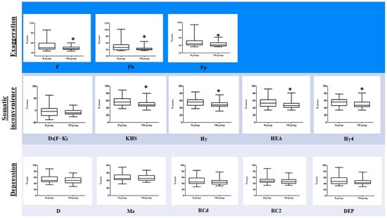 MMPI-2 is one of the most commonly used psychological tests. A revision of the original MMPI was published by the University of Minnesota Press. It is a self-report inventory with 567 questions designed to aid in the diagnosis of mental health disorders. The validity of MMPI-2 protocols has been evaluated using the VRIN scale (T-score < 80) or TRIN scale (T-score < 80), with fewer than 30 omitted items []. In this study, we focused on scales related to exaggeration, somatic inconvenience, and depression. The following MMPI-2 scales were the main lists examined in this study (a total of 13 scales): exaggeration (F, Fb, Fp), somatic inconvenience (Ds(F-K), KHs, Hy, HEA, Hy4), and depression (D, Ma, RCd, RC2, DEP), defined as sMMPI-2 (selected MMPI-2). Considering that exaggeration, psychological depression, and somatization symptoms are related, these scales were included in this study [,]. In this study, exaggeration, somatic inconvenience, and depression using the T-score of MMPI-2 were defined as follows: exaggeration, F or Fb or Fp > 80; somatic inconvenience, either Ds(F-K) or KHs or Hy or HEA or Hy4 > 70; and depression, either D or Ma or RCd or RC2 or DEP > 70 [,,].