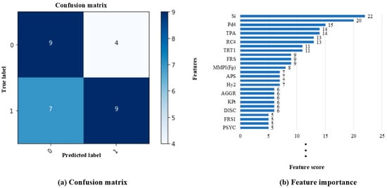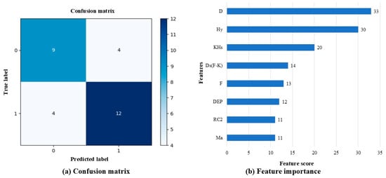 XGBoost analysis of the wMMPI-2 scales to classify the D and ND groups. wMMPI-2, whole MMPI-2; D, deception; ND, non-deception; 0, non-deception; 1, deception. Abbreviations for the MMPI-2 scales are defined in Table 1. (a) Confusion matrix; (b) feature importance depending on the f1-score.