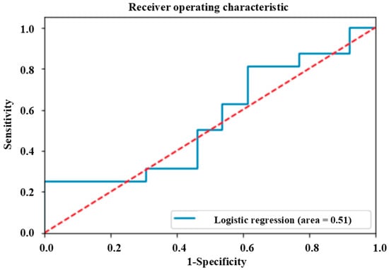There was no relationship between the sMMPI-2 scales and pain deception in the multivariable logistic regression analysis (Table 5). The logistic regression classifier on the test set did not show any diagnostic value for pain deception. The area under the curve (AUC) was 0.51 (Figure 5). The accuracy, precision, recall, and f1-score was 0.52, 0.51, 0.51, and 0.51, respectively.