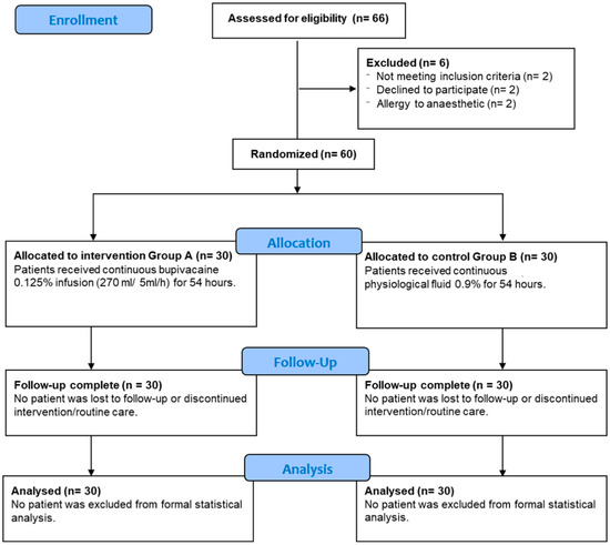 We also excluded patients who had undergone repeated laparotomy and wound dehiscence since repeated surgical interventions could potentially hinder accurate monitoring of the self-reported pain scale, the quantity and duration of opioids administered, and the secondary outcomes of the study. Accordingly, 66 patients were deemed eligible for participation in the trial. However, six patients were excluded from participation due to conversion to acute surgery post-massive bleeding, bupivacaine allergy, and refusal to participate in the trial (Figure 1).