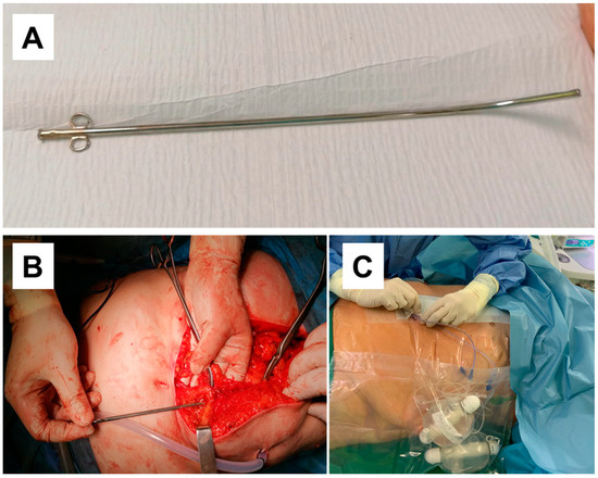 (A) Tube for perforated catheter insertion into the retro-muscular space; (B) Tube insertion technique; (C) Catheters connected to two “Easy Pumps” at the end of the surgery.