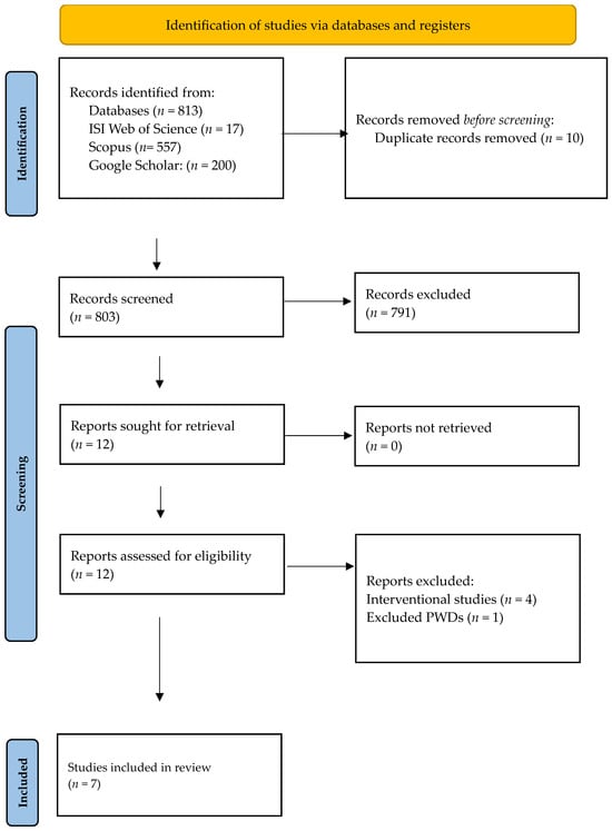The initial search yielded 813 records. After excluding 10 duplicates, 803 articles were screened based on their titles and abstracts. Covidence was used for management of the bibliography and duplicates were removed using the automation feature. Cohen’s Kappa for literature screening was 0.91, for data extraction it was 0.79, and for risk of bias it was 0.72. Of these, 791 articles were excluded because they did not meet the inclusion criteria for this review. As a result, 12 articles were selected for full-text review. However, five of these articles were further excluded—four due to being interventional studies [33,34,35,36] and one because it did not specifically mention or include PWDs as part of its study population [37]. Ultimately, seven articles were included in this review [38,39,40,41,42,43,44]. The results of the literature search are presented in the PRISMA flow diagram below (Figure 1).