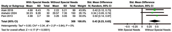 The meta-analysis comparison of parental indices indicated there was a significantly higher concern among parents of children with disabilities. Two of the included studies focused on autism spectrum disorder (ASD), while one study did not specify the type of disabilities among the participants [23,24,29]. The forest plot reveals a combined standard mean difference (SMD) of 0.43 (95% CI: 0.23 to 0.63), indicating that parents of PWDs have a higher magnitude of stress or concerns compared to those without disabilities. The heterogeneity analysis shows an I2 of 0%, suggesting no observed variability between the study results. The overall effect test result is highly significant (z = 4.17; p < 0.0001), underscoring a consistent and statistically significant difference favouring the group with disabilities. Figure 2 provides a visual representation of these results.