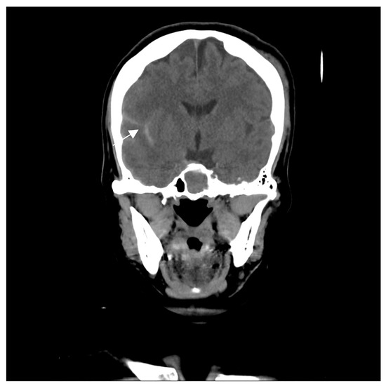 The figure reveals a small subdural hematoma over the right temporal lobe (arrow), sylvian subarachnoid hemorrhage, and right sellar floor fracture with sphenoid sinus hematoma.
