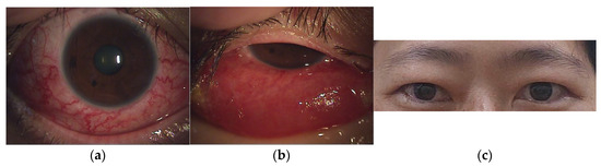 (a) Right eye proptosis and conjunctiva vessel engorgement, without chemosis. (b) Rapidly progressive severe right eye exophthalmos and chemosis developed in several days. (c) After 1 month of treatment, the right eye had a full recovery without strabismus.