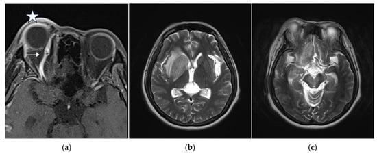 (a) Brain magnetic resonance imaging (MRI) axial view, T1-weighted imaging with contrast disclosed engorgement of right superior ophthalmic vein (arrow head), and swelling of right orbital cavity (star); (b) brain MRI axial view, T2-weighted imaging show high T2 signal change in right corpus striatum; and (c) axial view of brain MRI T2-weighted imaging show enhancement at right insular lobe, right frontal inferior lobe, right medial temporal lobe, midbrain, and pons, which indicate perifocal cerebral edema.