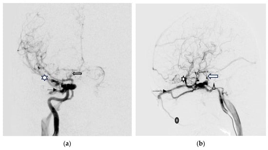 - Iampreechakul, P.; Wangtanaphat, K.; Chuntaroj, S.; Wattanasen, Y.; Hangsapruek, S.; Lertbutsayanukul, P.; Siriwimonmas, S. Spontaneous complete regression of malignant cavernous sinus dural arteriovenous fistula following partial transarterial embolization with liquid embolic material: Report of two cases. Surg. Neurol. Int. 2023, 14, 307. [Google Scholar] [CrossRef]