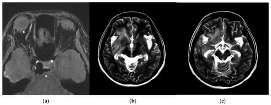 (a) Brain MRI was followed up 3 days after endovascular treatment: axial view of brain MRI T1-weighted imaging with contrast disclosed significantly decreased engorgement of the right superior ophthalmic vein (arrow head); (b,c) brain MRI axial view, T2-weighted imaging showed less perifocal edema in the right corpus striatum, midbrain, and pons comparing to the condition before endovascular treatment.