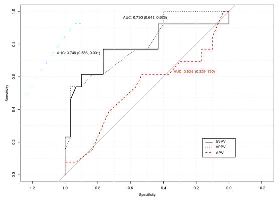 Receiver operating characteristic (ROC) curve demonstrating the ability of Δpleth variability index (PVI), Δstroke volume variation (SVV), and Δpulse pressure variation (PPV) in predicting a stroke volume increase of ≥15%; AUC, area under the curve.