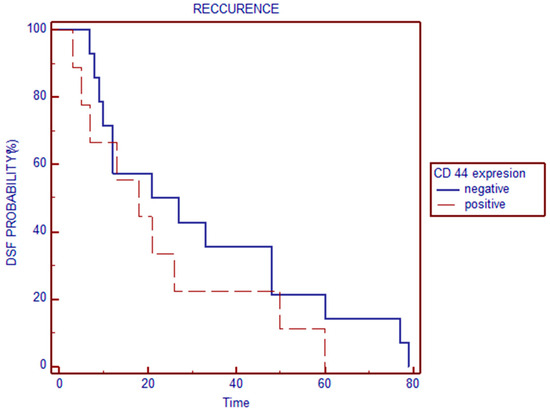 We introduced Kaplan–Meier and log-rank tests (taking into consideration the time course) in analyzing the relation of CD44s immunoexpression to biochemical recurrence. The log-rank test did not show an association between CD44 expression score (negative/positive) and biochemical recurrence (p = 0.3095) (Figure 7).