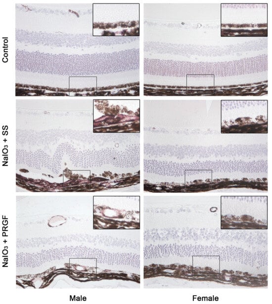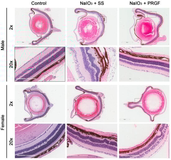 - Liu, Y.; Li, Y.; Wang, C.; Zhang, Y.; Su, G. Morphologic and histopathologic change of sodium iodate-induced retinal degeneration in adult rats. Int. J. Clin. Exp. Pathol. 2019, 12, 443–454. [Google Scholar]