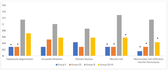 Rat Liver Tissue Histopathological Findings. * p < 0.5: Compared with Group IR; Group C: Control group; Group CO: Cerium oxide group; Group IR: Ischemia-reperfusion group; Group CO-IR: Cerium oxide-Ischemia-reperfusion group.