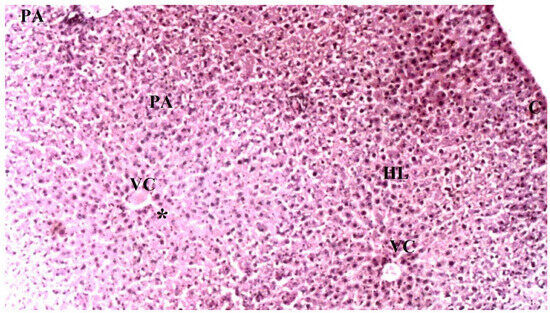 Representative light microscopy of liver tissue from the control group (PA: portal space, VC: vena centralis, *: sinusoids, HL: hepatic lobule), (H&EX40).
