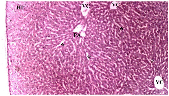 Representative light microscopy of liver tissue from the cerium oxide group (PA: portal space, VC: vena centralis, *: sinusoids, HL: hepatic lobule), (H&EX40).