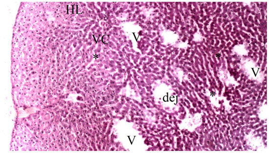 Representative light microscopy of liver tissue from the ischemia-reperfusion group (PA: portal space, VC: vena centralis, *: sinusoid dilatation, HL: hepatic lobule, dej: hepatocytes and vena centralis degeneration, V: portal vein), (H&EX40).
