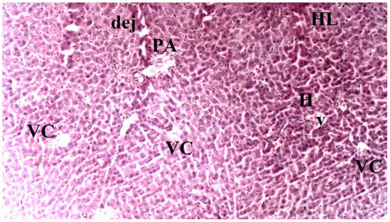 Representative light microscopy of liver tissue from cerium oxide-ischemia-reperfusion group (PA: portal space, VC: vena centralis, H: hepatocyte, HL: hepatic lobule, dej: hepatocytes and vena centralis degeneration, V: portal vein), (H&EX40).