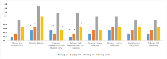 Rat Kidney Tissue Histopathological Findings. * p < 0.5: Compared with Group IR; Group C: Control group; Group CO: Cerium oxide group; Group IR: Ischemia-reperfusion group; Group CO-IR: Cerium oxide-Ischemia-reperfusion group.
