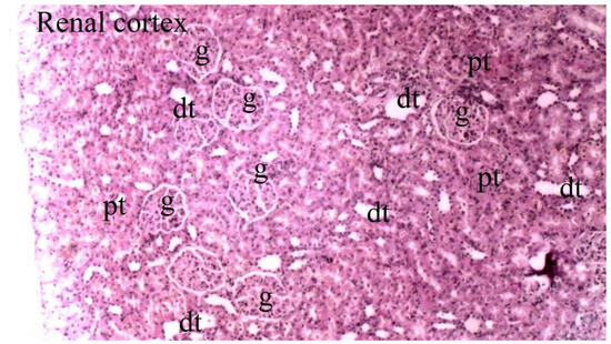 Representative light microscopy of kidney tissue from the control group (pt: proximal tubule, dt: distal tubule, g: glomerulus) (H&EX40).