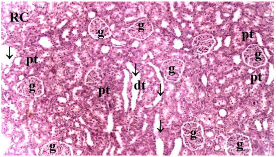 Representative light microscopy of kidney tissue from the cerium axide group (RC: renal cortex, pt: proximal tubule, dt: distal tubule, g: glomerulus, ↓: dilate tubule) (H&EX40).