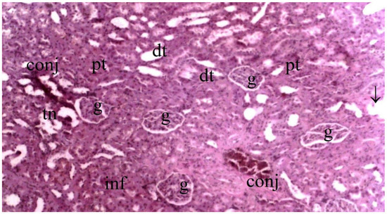 Representative light microscopy of kidney tissue from ischemia/reperfusion group (pt: proximal tubule, dt: distal tubule, g: glomerulus, m: macula densa, v: vacuolization, ↓: dilate tubule, conj: congestion, inf: inflammation, tn: tubular cell degeneration and necrosis) (H&EX40).