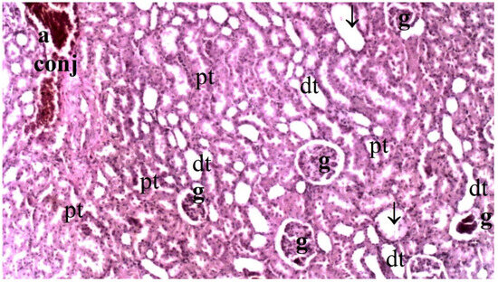 Representative light microscopy of kidney tissue from the cerium oxide ischemia-reperfusion group (pt: proximal tubule, dt: distal tubule, g: glomerulus, ↓: dilate tubule, conj: congestion, a: artery) (H&EX40).