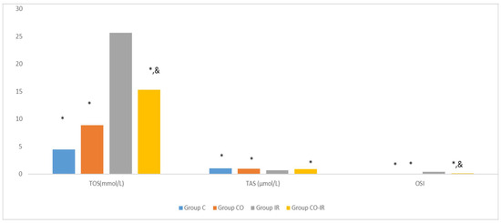 Rat Serum Total Oxidant Status, Total Antioxidant Status and Oxidative Stress Index. *: p < 0.05: Compared to Group IR; &: p < 0.05: Compared to Group C; Group C: Control group; Group CO: Cerium oxide group; Group IR: Ischemia-reperfusion group; Group CO-IR: Cerium oxide-Ischemia-reperfusion group.